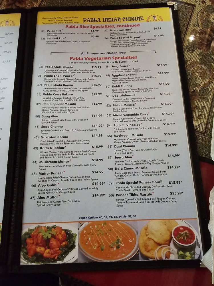 Pabla Indian Cuisine is a classy and casual Indian vegetarian restaurant located in Renton, WA. With a wide range of vegan and limited vegetarian options, Pabla offers a diverse menu suitable for all preferences. From delicious appetizers like Vegetable Samosas and Vegetable Pakoras to refreshing beverages like Chai Spiced Tea and Mango Lassi, their menu is sure to delight your taste buds. The restaurant also offers soups, salads, and side orders, such as Pabla Tomato Soup and Vegetable Raita, showcasing the authentic flavors of Indian cuisine. Whether you're looking for a quiet dinner for two or catering for a group event, Pabla Indian Cuisine is the perfect choice for a flavorful and satisfying meal experience.